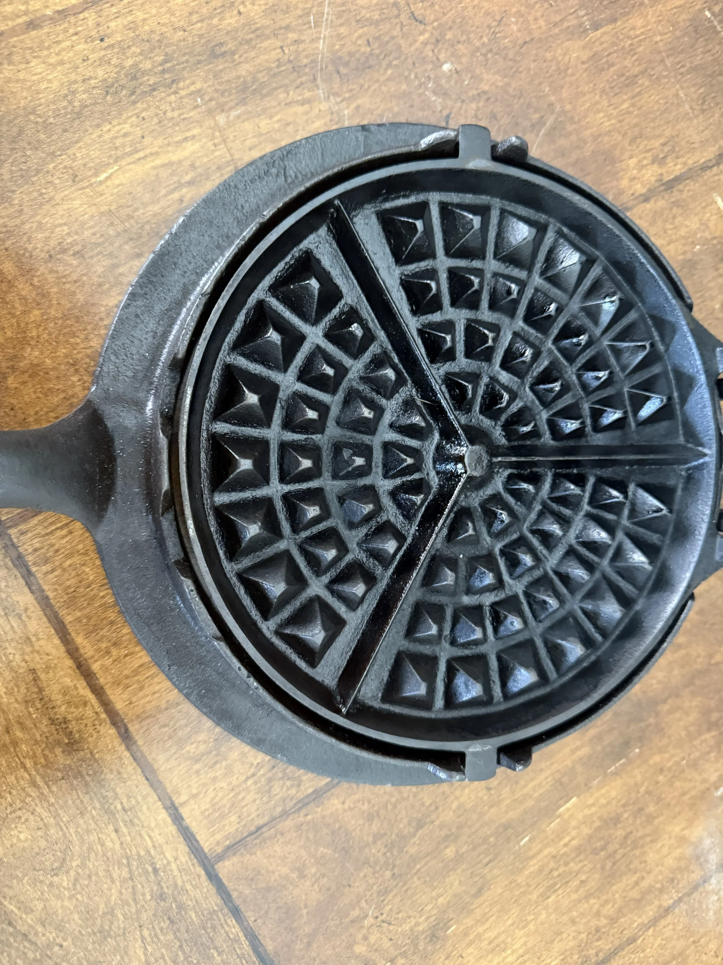 There are pieces in a collection that document a foundry. And then there are pieces that define a collection. This waffle iron is the latter. It arrived at SSC in a state of professional restoration so perfect that it looks as though it left the Resor foundry yesterday—not a hundred and forty years ago. The casting is flawless. The seasoning is uniform, deep, and lustrous. The hinge operates smoothly. The radial fan waffle pattern on both plates is crisp and sharp, with every pyramid and every grid line intact. The ring base is complete and undamaged. The high loop handle rises above the iron in a graceful arc. There is not a single flaw anywhere on this piece—no cracks, no pits, no chips, no warping, no repairs. It is, without qualification, museum quality.