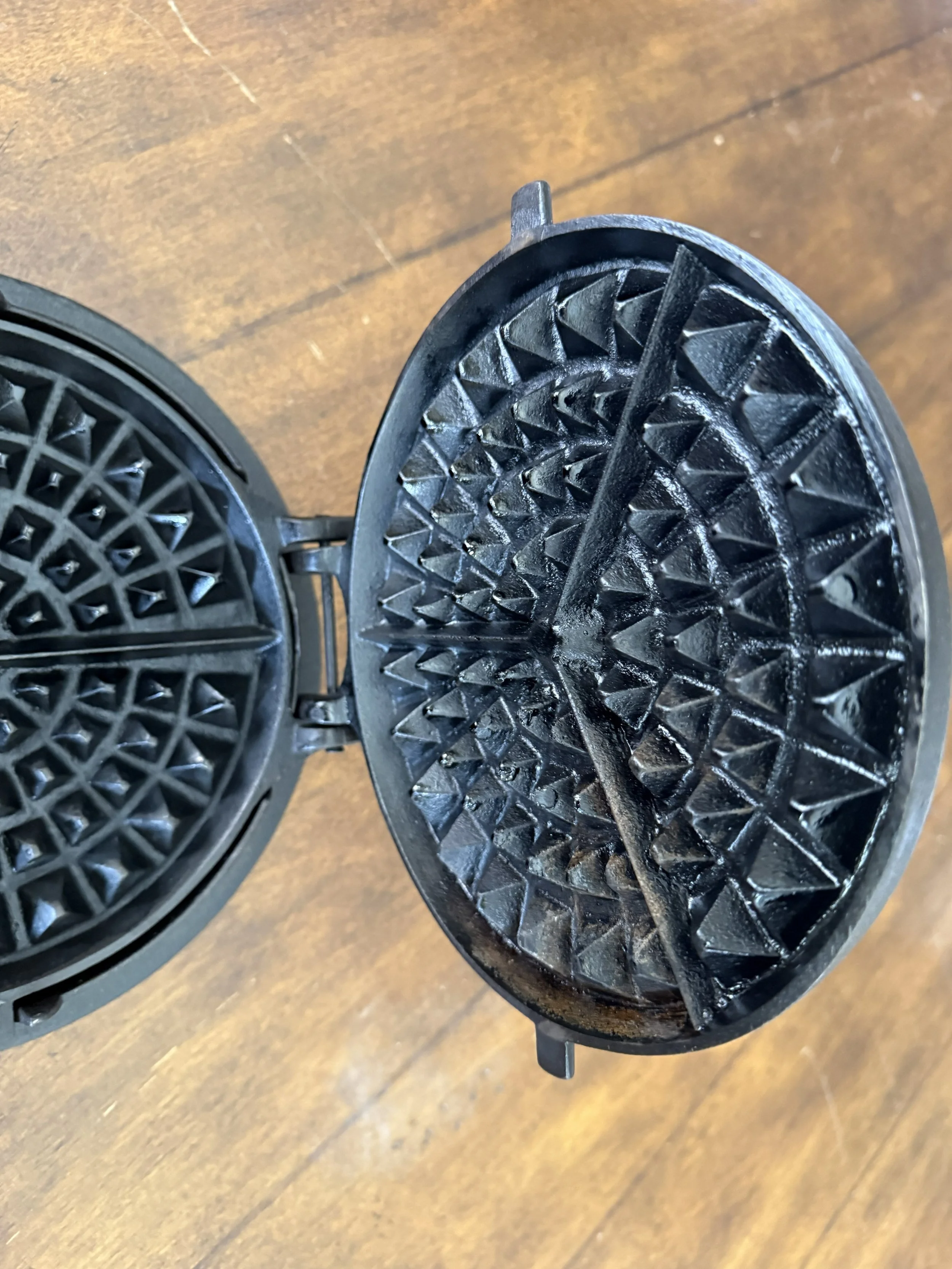 Detail of the upper plate interior showing the matching radial fan pattern. The upper plate’s pyramids are slightly different in proportion from the lower—a common feature in waffle irons, where the two plates create interlocking patterns that produce uniform waffle depth on both sides. The seasoning on the interior cooking surface is uniform and shows no evidence of pitting, corrosion, or prior damage.